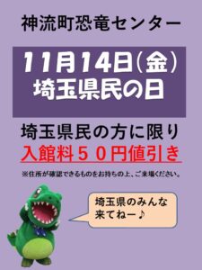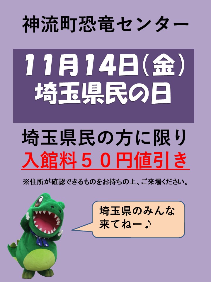 恐竜センター > お知らせ > お知らせ 埼玉県民の日 埼玉県民の方入場料割引です! 投稿日:2025年10月28日 11月14日(金)埼玉県民の日 埼玉県に住所がある方の入場料が50円値引きとなります。 住所が確認できるものをお持ちの上、ご来場ください。 ※他の割引(団体割引・モンベル割引など)との併用はできません。 Twitter Share Pocket Hatena LINE コピーする