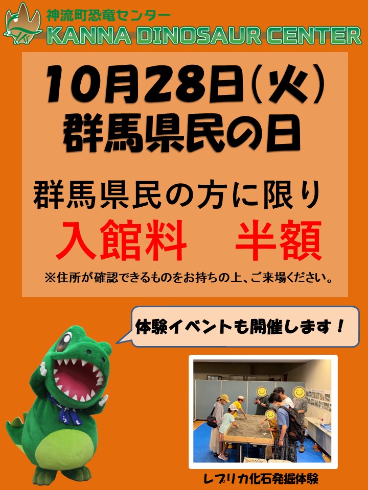 恐竜センター > お知らせ > お知らせ 2025 群馬県民の日(県民の方入場料半額) 投稿日:2025年10月15日 群馬県民の日は群馬県に住所がある方の入場料が半額※となります。 住所が確認できるものをお持ちの上、ご来場ください。 ※他の割引(団体割引・モンベル割引など)との併用はできません。 予約なしでできる「レプリカ化石発掘体験」も開催します! Twitter Share Pocket Hatena LINE コピーする